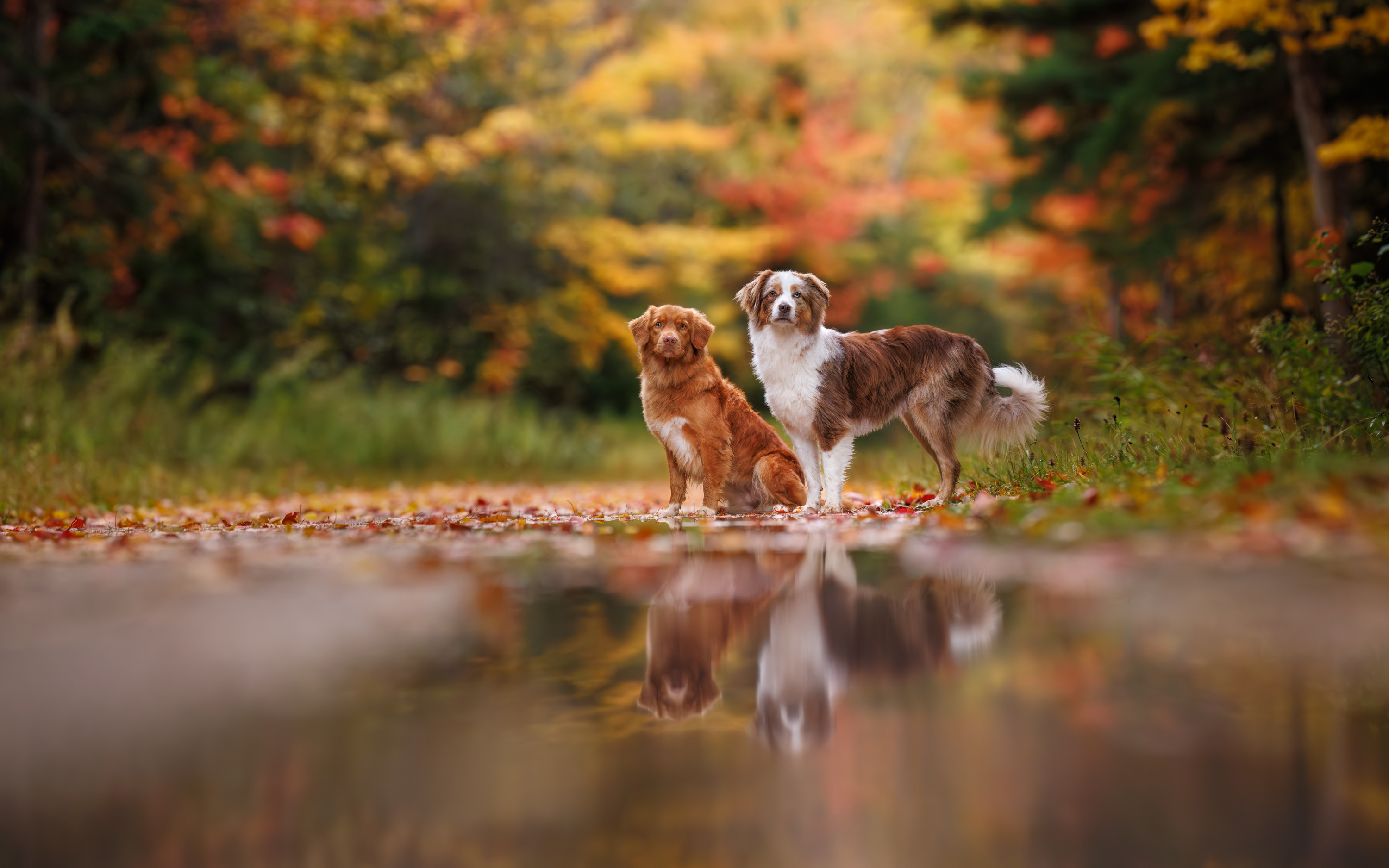 This image was made right at the start of a very early morning session on a gorgeous flat trail near where we were staying. It had just rained, leaving plenty of puddles, so the obvious choice was to position the dogs and shoot from an angle that captured their reflections. I then “shot around” the edges of the frame with the intention of stitching the images together to expand the field of view, while keeping the super shallow depth of field that renders both the foreground and background beautifully soft.