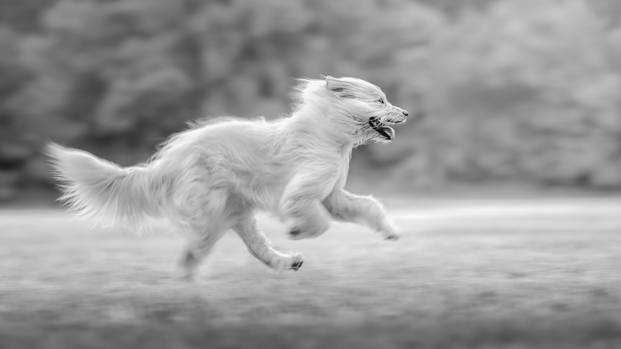 The light airy nature of this along with the black and white treatment give this a gorgeous dreamlike quality. The dog is perfectly suited for this challenges technique, the sharpness and blur throughout the fur add to the dreamy feeling.