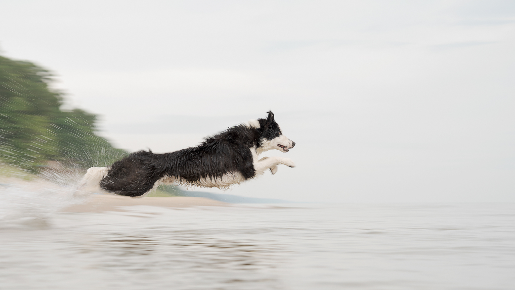 The motion and energy in this image are excellent. The slow shutter speed used has given the surface of the water a brushed metal look and the splashes seem to explode from the dog.