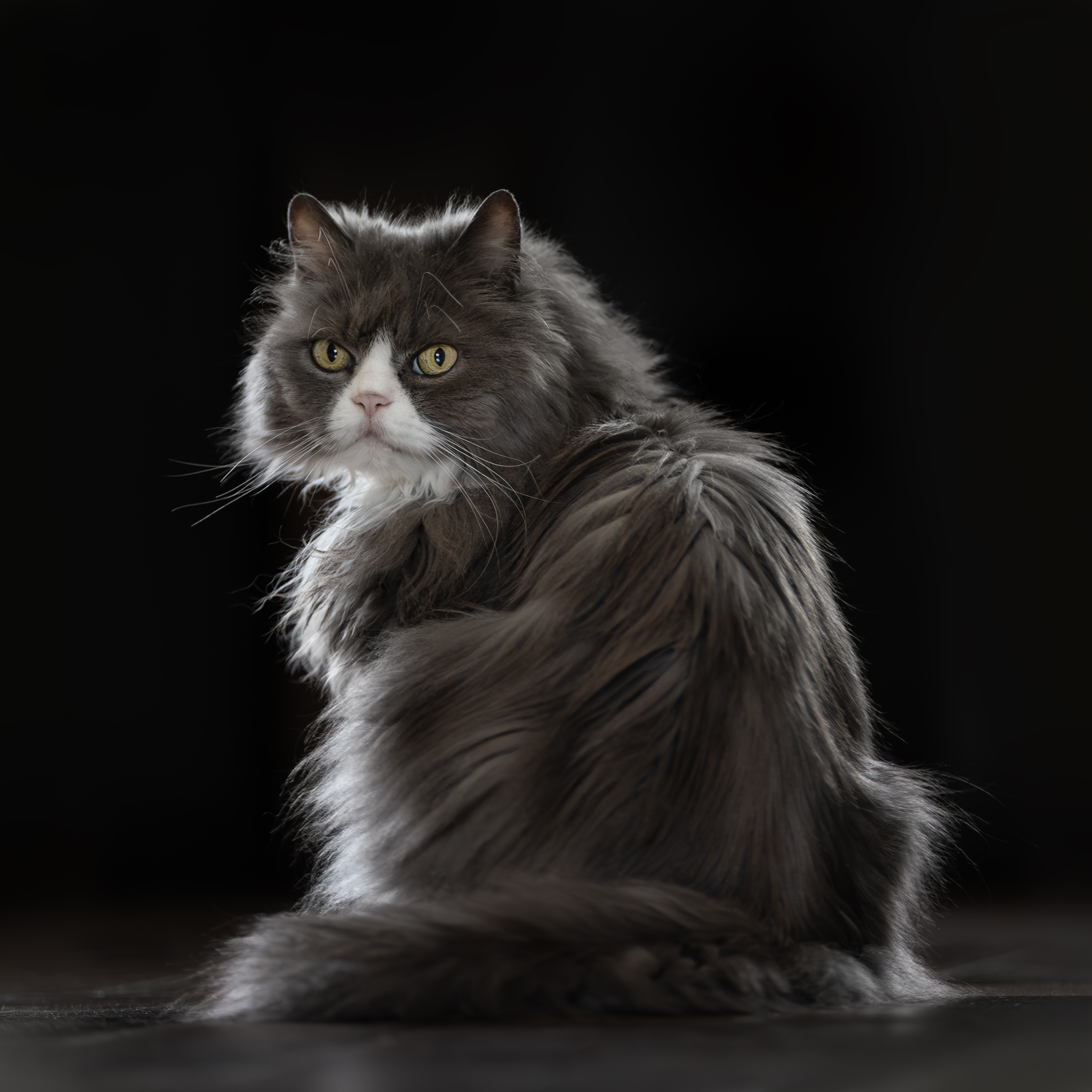 This peekaboo style image is well-crafted and sits nicely in the rule of thirds. The edit on the black fur is executed perfectly. The limited colour palette gives the image a clean feel.